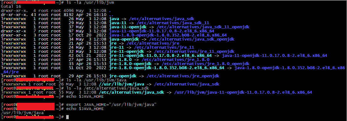 /usr/lib/jvm 디렉토리를 보면 java 명령어가 링크로 되어 있고 경로 /etc/alternatives/java_sdk 를 가르킨다. 다시 /etc/alternatives/java_sdk 를 ls 명령어로 확인하면 링크로 되어 있고 실제 파일의 경로는 /usr/lib/jvm/java-11-opensjk-11.0.17.0.8-2.el8.6_x86_64 가 우리가 보통 사용하는 java 명령어 실행 파일이다.