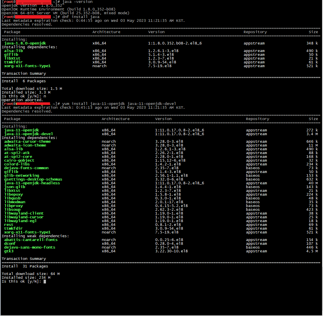- dnf 로는 java 11 openJDK 가 안 보인다. yum 으로 설치한다.
