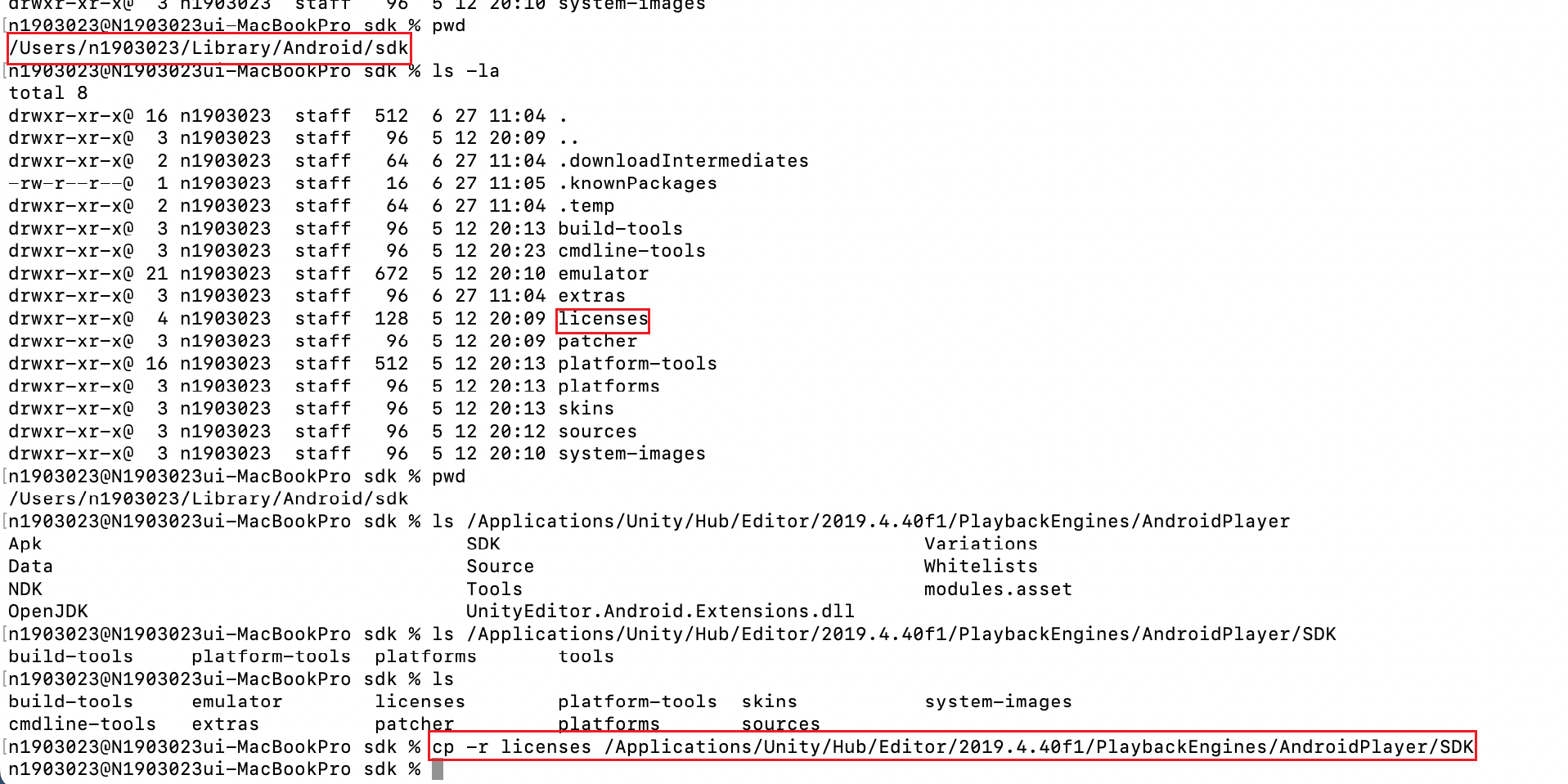 Android SDK 에 있는 licenses 디렉토리를 Unity (2019.4.40f1) SDK 디렉토리에 복사하고 나서 다시 빌드를 하면 오류 메시지는 사라진다.