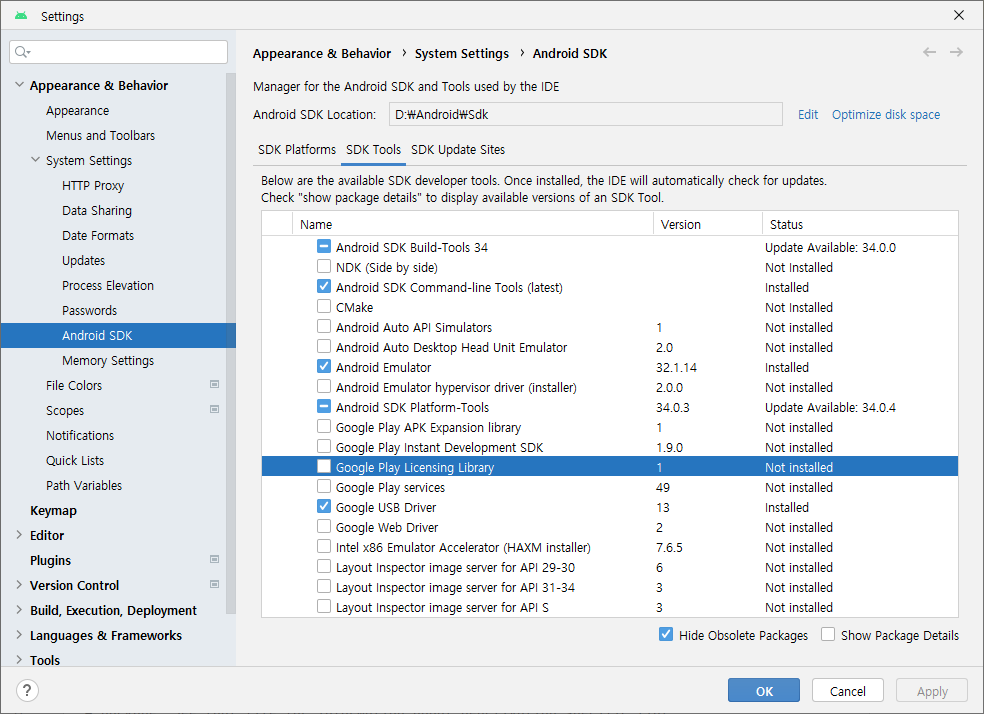 먼저 라이선스 파일을 설치하는 방법으로는 Android Studio 에서 "Apperance & Behavior" - "System Settings" - "Android SDK" - "SDK Tools" "Google Play licensing Libray" 를 클릭하고 설치하면 된다.