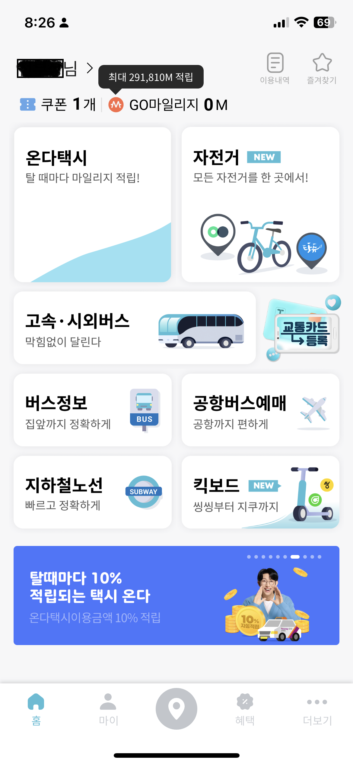 서비스를 이용할때 마다 마일리지가 붙는데, 대중 교통에 사용하는 신용카드를 등록해도 마일리지가 쌓인다.
