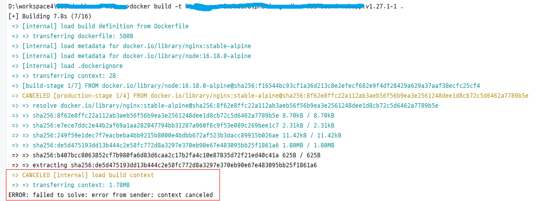 | => CANCELED [internal] load build context => => transferring context: 1.78MB ERROR: failed to solve: error from sender: context canceled |