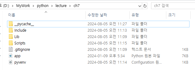이미 존재하고 있던 ch7 이라는 디렉토리에 가상 환경을 적용하면 하위에 Include/, Lib/, Scripts/, pyvenv.cfg 의 디렉토리, 파일들이 추가된다.