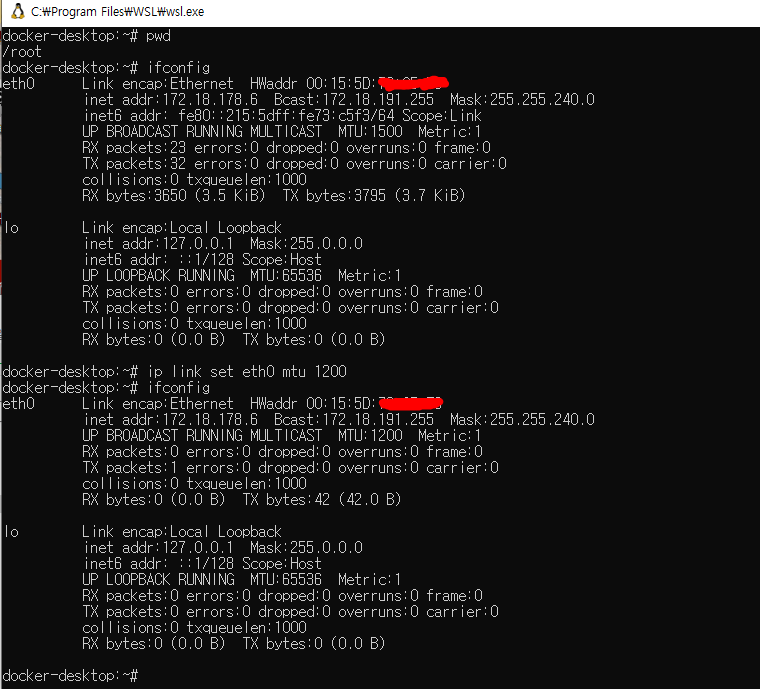 2. WSL 에서 기본 인터페이스인 eth0 의 mtu 사이즈를 1500 에서 1200 으로 강제 조정 (호스트 PC 의 인터페이스가 조정이 되는거는 아니고 가상 어댑터가 변경해도 상관없을듯하다.)