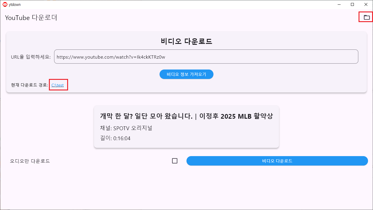 5. 오른쪽 상단의 폴더 아이콘을 클릭하면 현재 다운로드 경로를 변경할 수 있습니다.