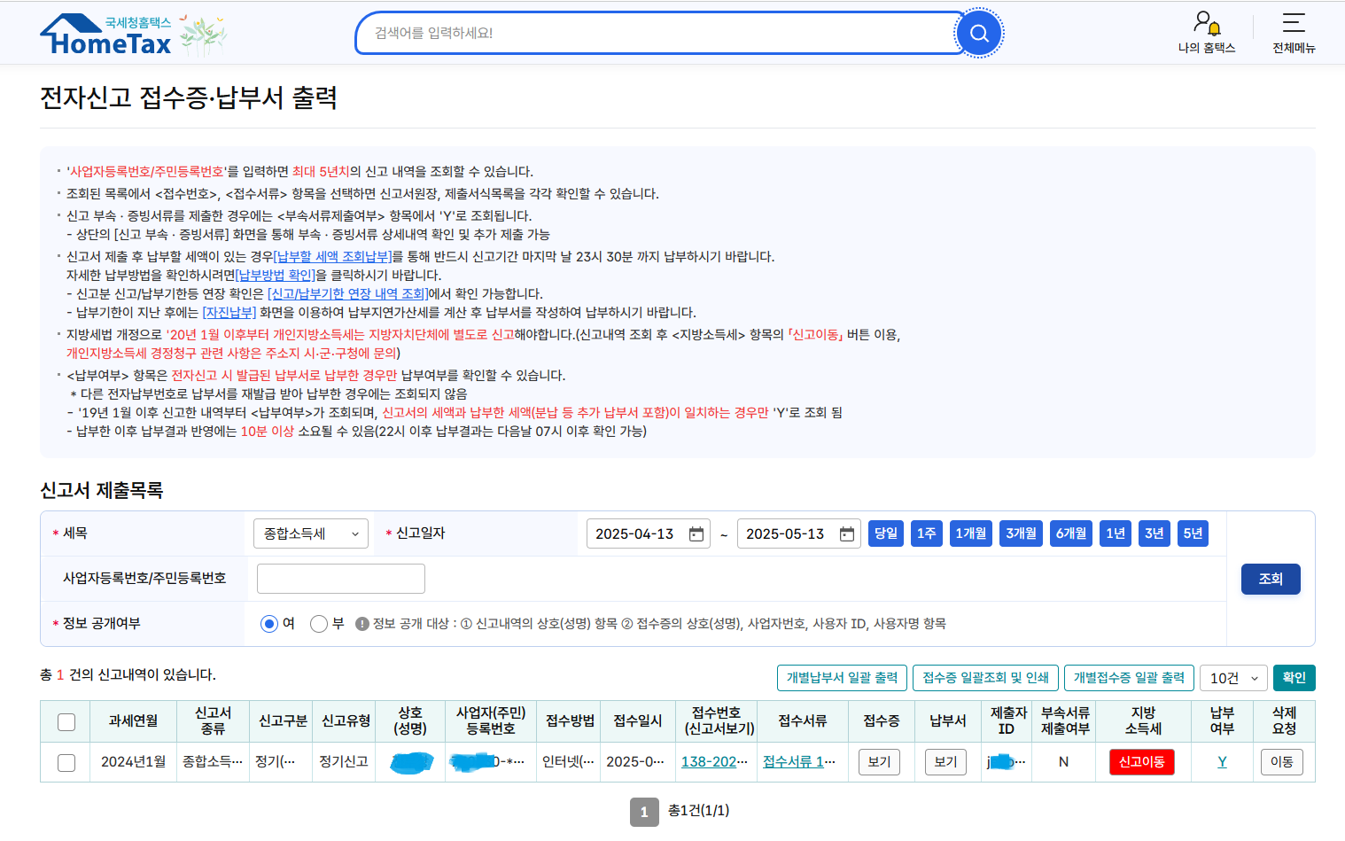 전자신고 접수증/납부서 출력에 들어가서 *세목을 "종합소득세" 로 바꾸고 조회를 해보니, 가이드 내용대로 "지방 소득세" 버튼이 보인다.