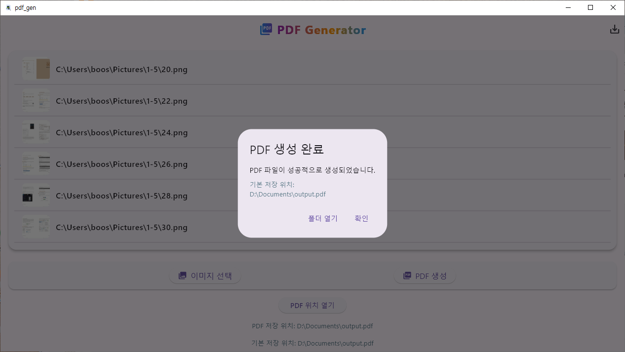 4. 생성 완료 되면 "폴더 열기"를 클릭해서 기본 저장 위치인 Document 폴더로 이동하고, "output.pdf" 파일을 열어서 확인할 수 있습니다.