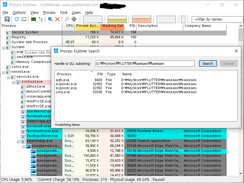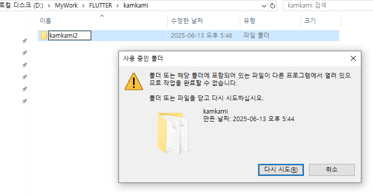 "kamkami\kamkami" 라는 폴더를 잡고 있는 프로세스들이 보이는데, 나 같은 경우는 adb.exe 가 문제였다. 작업관리자에서 "adb.exe" 프로세스를 종료하고 나니 폴더명 변경이 가능해졌다.