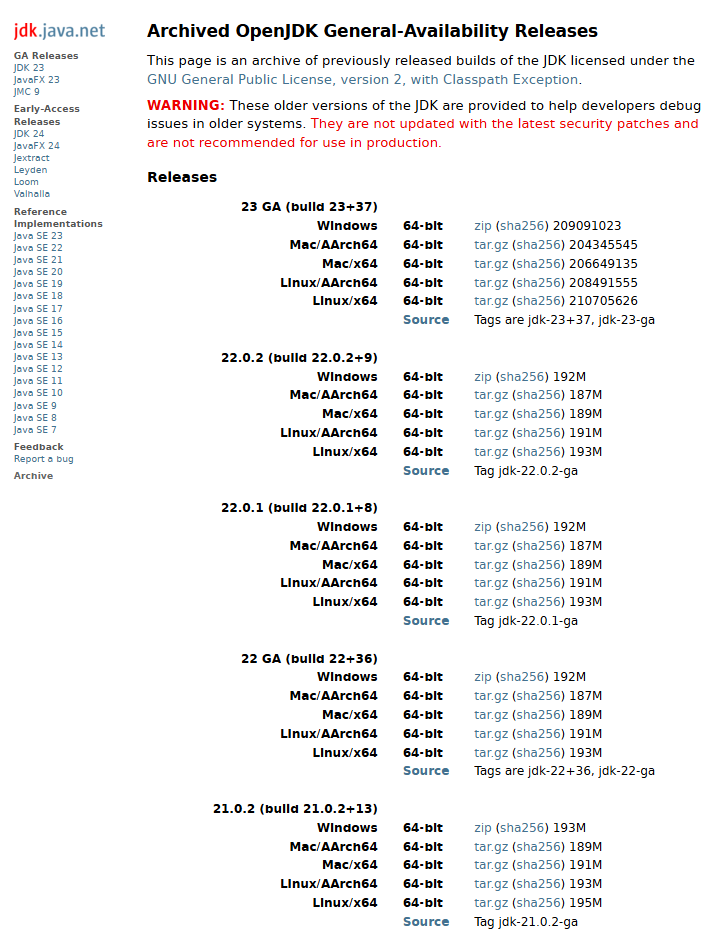 어느 순간부터 구글에서 OpenJDK 를 다운받을려고 검색하면 oracle 만 나온다.OpenJDK 필요한 경우가 많은데 빨리 다운로드 하기 위해 https://jdk.java.net/archive/ 이 사이트로 접근하는 기록을 남긴다. 여러 OS 용으로 지원하니 다운받고 풀어서 JAVA_HOME 설정만 잘 맞추면 된다. 참고https://www.theserverside.com/blog/Coffee-Talk-Java-News-Stories-and-Opinions/How-to-install-Java-21