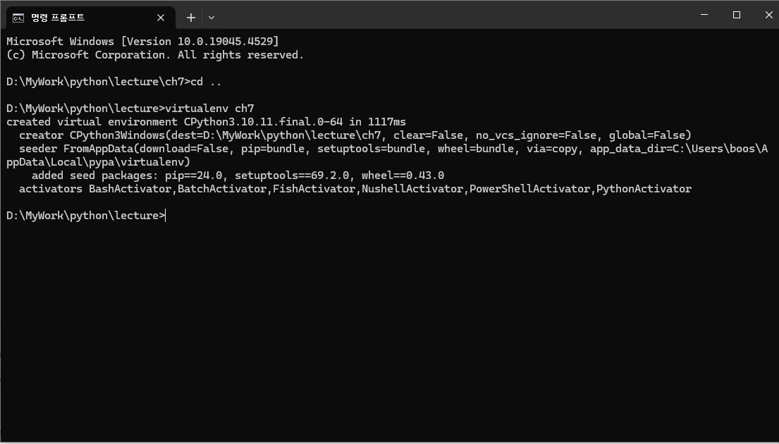 파이썬 개발을 하려고 하는 상황마다 다르게 파이썬 버전이나 특정 라이브러리를 유지하려고 할때, 가상환경을 사용할 수 있다. $ pip install virtualenv$ virtualenv [가상환경 적용할 디렉토리명]$ app-env\Scripts\activate 아래 예제에서는 lecture 라는 디렉토리에서 ch7 이라는 가상 환경 디렉토리를 생성했다. 이미 존재하고 있던 ch7 이라는 디렉토리에 가상 환경을 적용하면 하위에 Include/, Lib/, Scripts/, pyvenv.cfg 의 디렉토리, 파일들이 추가된다. Scripts\activate 를 실행하고 나서, 앱 개발에 필요한 라이브러리들을 인스톨하면 Lib\site-packages 로 파일들이 추가되는 것을 볼 수 있다. virtu..