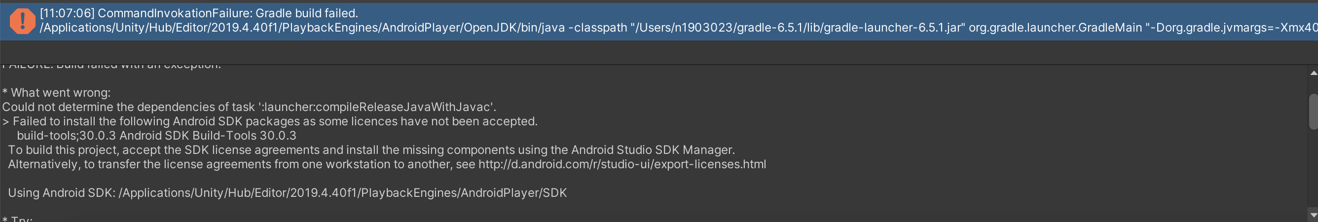 Unity 2019 에서 앱 빌드를 하는데, 아래와 같은 오류가 발생했다. "Failed to install the following Android SDK packages as some licenses have not been accepted. build-tools;30.0.3 Android SDK build-Tools 30.0.3 To build this project, accept the SDK license agreements and install the missing components using the Android Studio SDK Manager. Alternatively, to transfer the license agreements from one workstation to another..